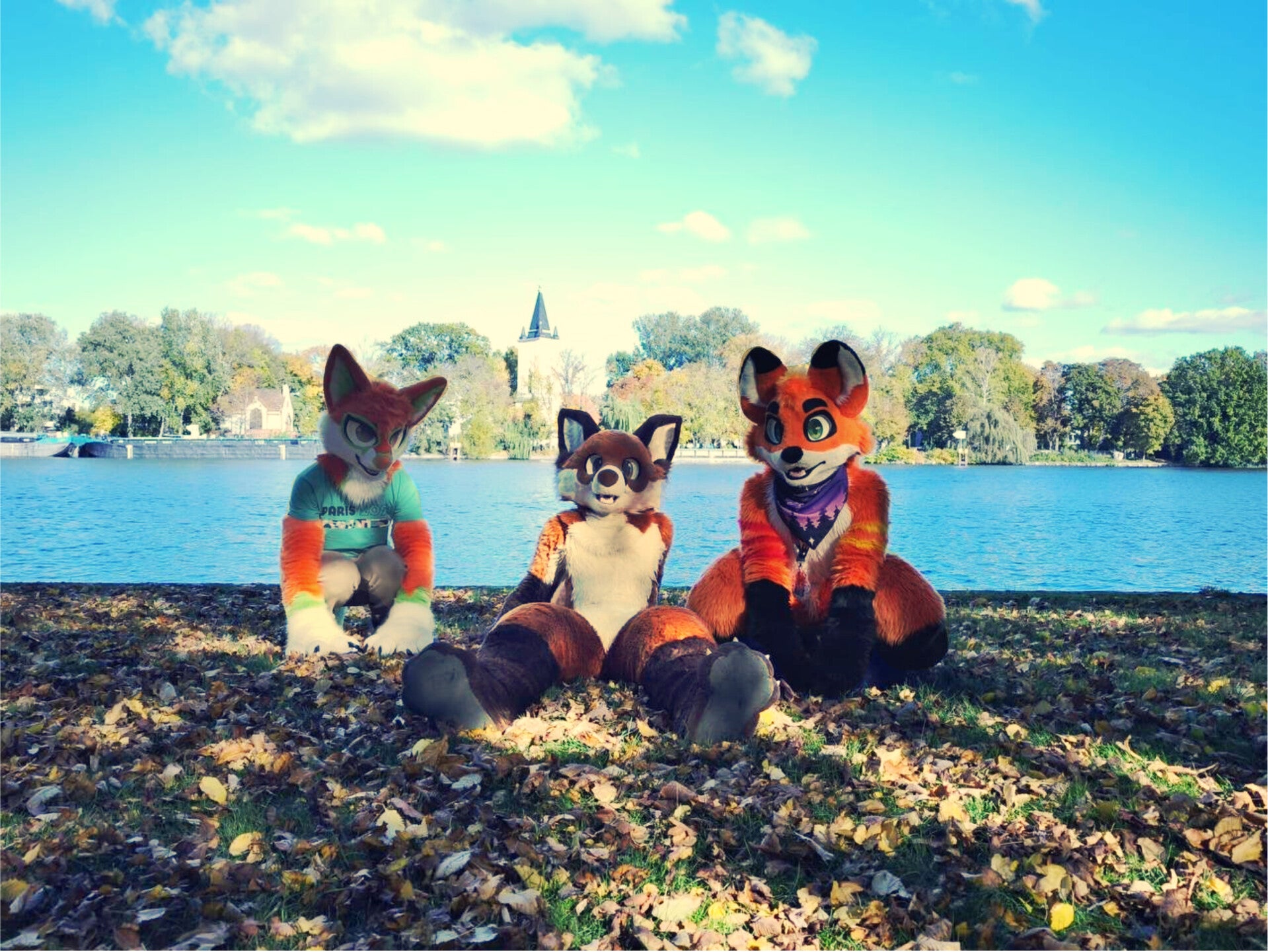 Am Sonntag war Dralor dann mit von der Partie. Seht doch nur mal, wie groß er ist. Basket ist ein Wolf, natürlich ist er also größer, als wir Füchse, das liegt doch auf der Pfote. Clovers Fell an den Armen ist übrigens endlich wieder nachgewachsen, wie ihr sicher bemerkt habt. vielleicht wächst ihm im nächsten Jahr ja noch mehr Fell? Wir hatten alle echt total viel Spaß mit euch. Ob jetzt wir jetzt mit euch vor einer der drei Bühnen mit euch getanzt, mit euch Fotos gemacht, oder ein wenig gespielt haben, nahezu alle von euch waren supi-dupi nett und freundlich und auch total interessiert. Wer wir denn sind und was wir machen. Hoffentlich sehen wir uns bald einmal wieder und dann stehen wir vielleicht sogar auf der Bühne und machen ein Quiz, oder wir machen mit euch davor Kinderdisco. Die Party vom Treptower Herbst ging zwar bis in die Nacht hinein, doch für uns markierte aber der Sonnenuntergang jeden tag unsere Heimreise. Gerne kommen wir nächstes Jahr wieder.